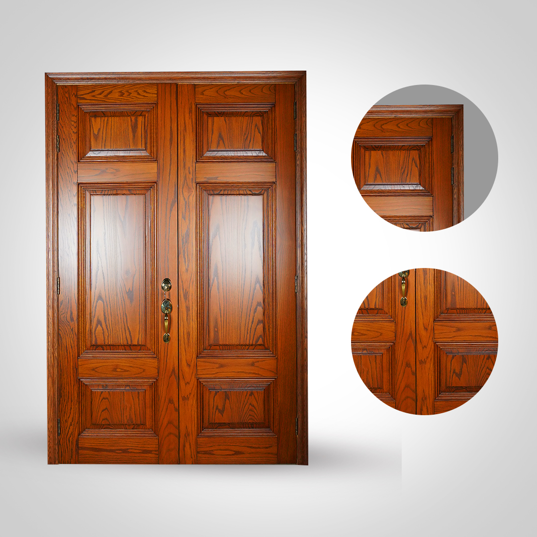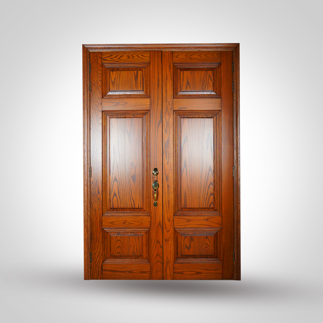 The classic double-panel design features intricately carved rectangular frames that bring depth, character, and refinement to any entryway. The natural Red Oak finish adds a touch of warmth and sophistication, ensuring the door becomes a striking focal point, whether placed as a main entrance door or in interior luxury spaces.