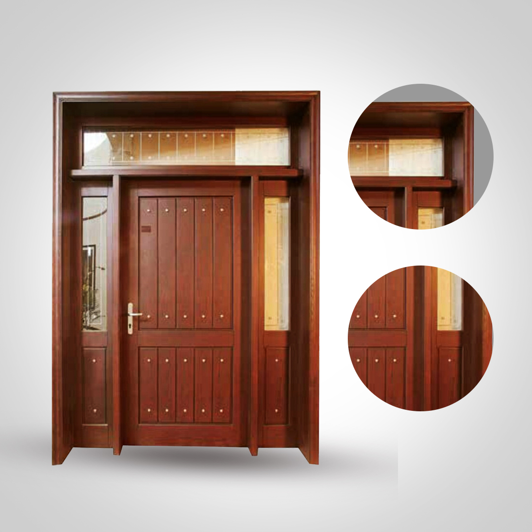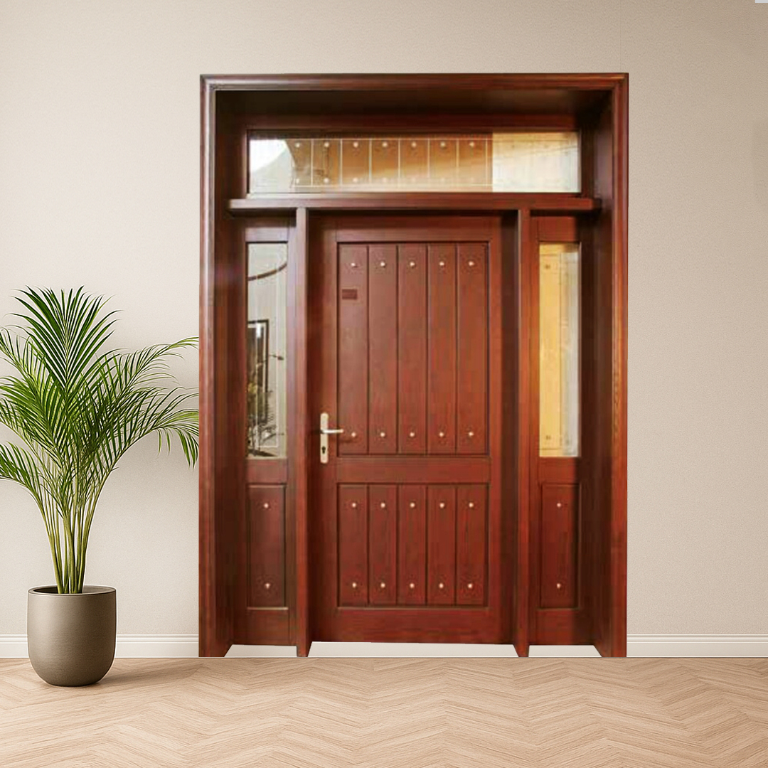 This stunning main entrance door is crafted from premium-grade mahogany wood, showcasing its natural rich texture and deep, warm hue. The design features a solid central door complemented by decorative vertical paneling and adorned with metallic studs for an elegant touch. Side and top transom glass panels allow natural light to illuminate your entryway while maintaining privacy. Perfect for adding a sophisticated and welcoming look to any home, this door combines durability, security, and timeless aesthetic appeal.