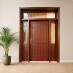 This main door is beautifully crafted from Sapale wood, featuring a classic double-door design with elegant paneling and brass handles. It’s a perfect choice for adding a touch of tradition and sophistication to any home entrance.