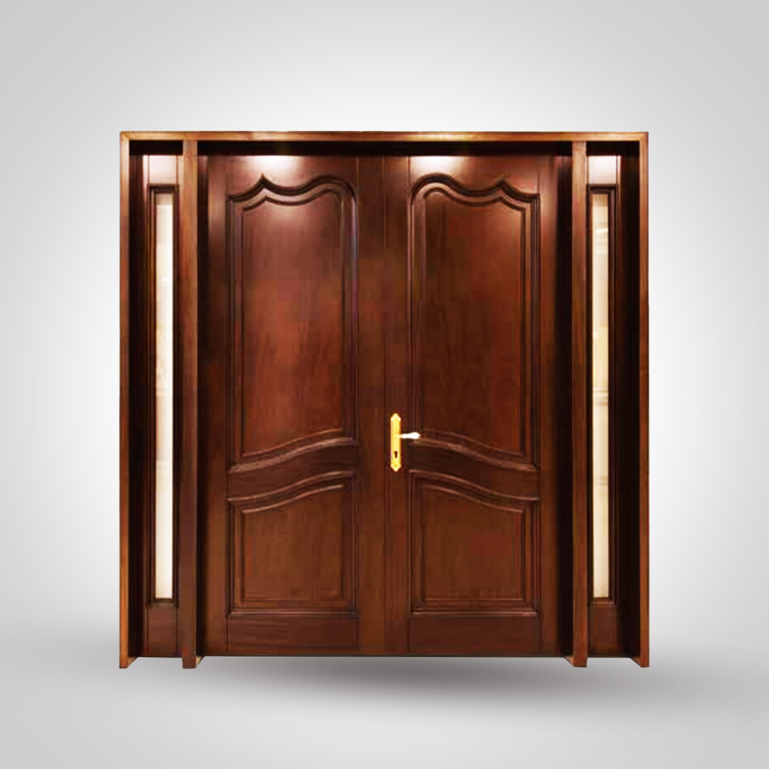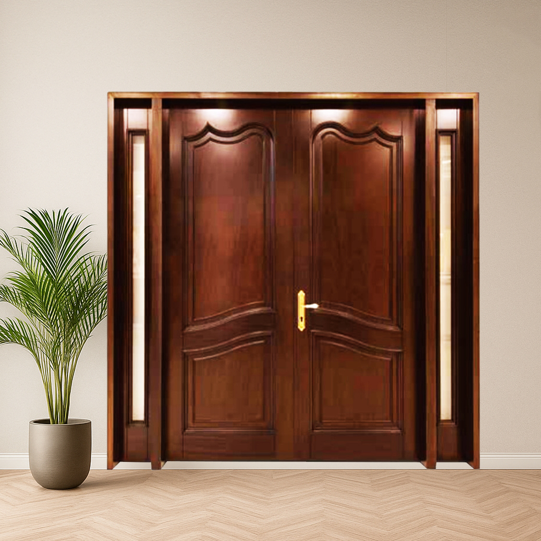 This two panel door is crafted from rich mahogany wood, this grand double-door design showcases timeless elegance with intricate paneling and a sophisticated aesthetic. Ideal for creating an impressive entryway for your home.
