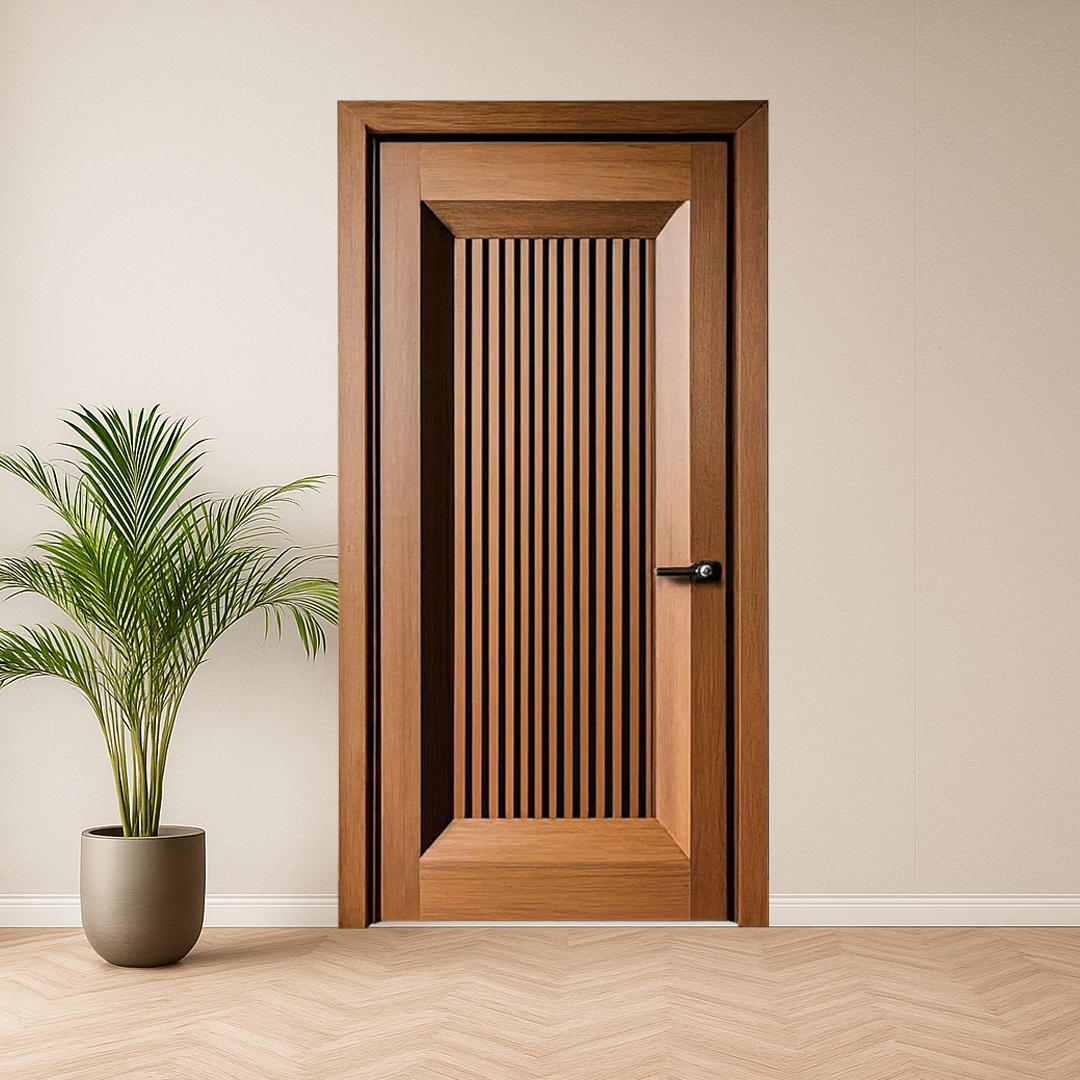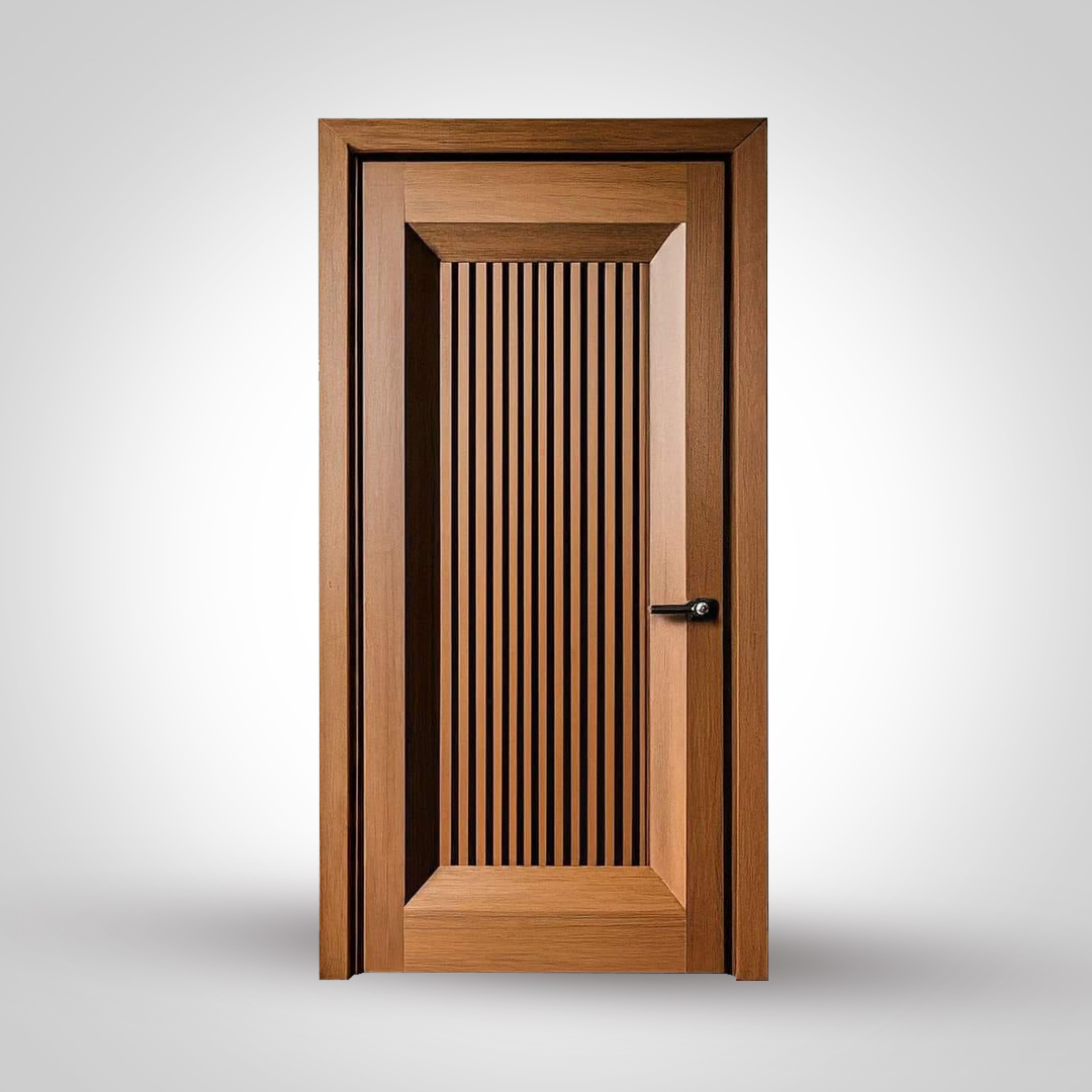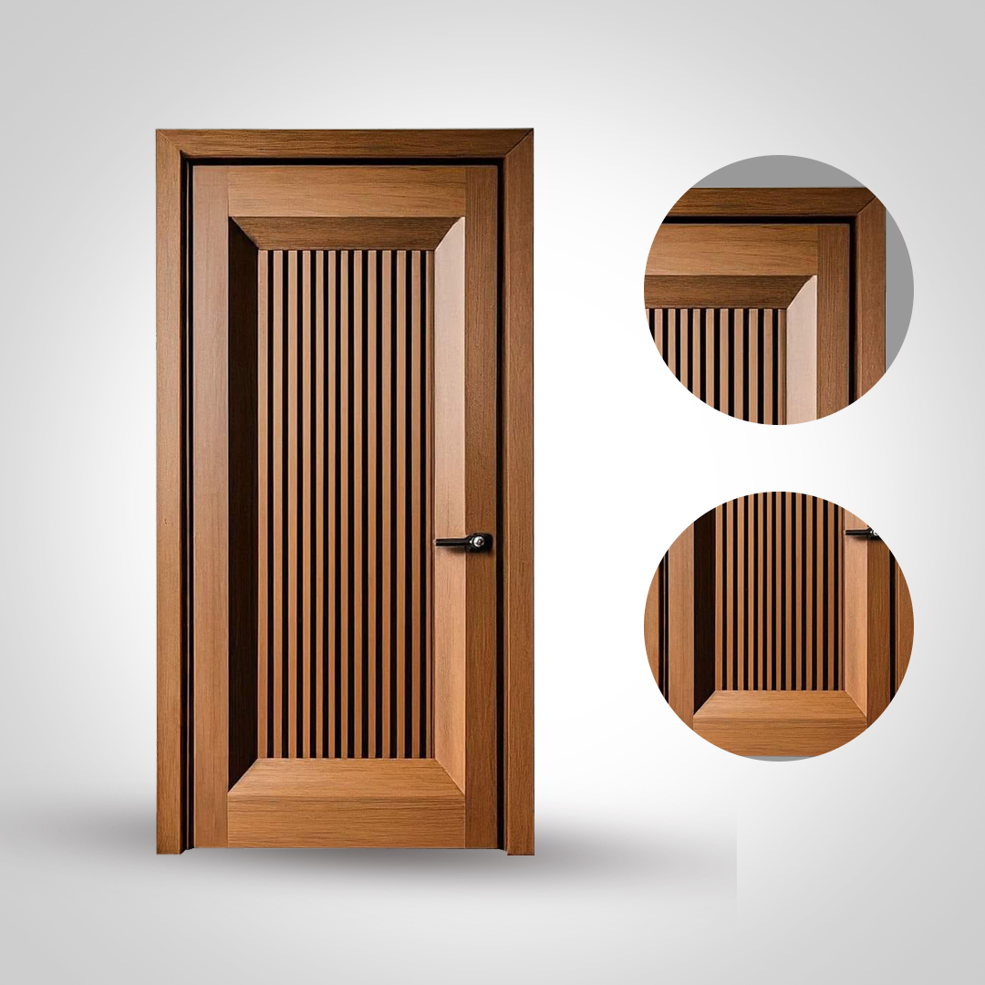 The Ostro door is a masterpiece of refined craftsmanship and timeless design, meticulously crafted from premium Sapale wood. Known for its exceptional strength, durability, and striking grain texture, Sapale wood lends this door an aura of natural luxury and sophistication. The vertically grooved center panel is thoughtfully designed to create a sense of rhythm and height, giving the Ostro door a bold yet graceful presence that complements both modern and classic interiors.