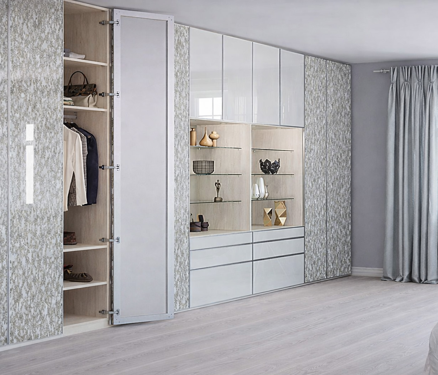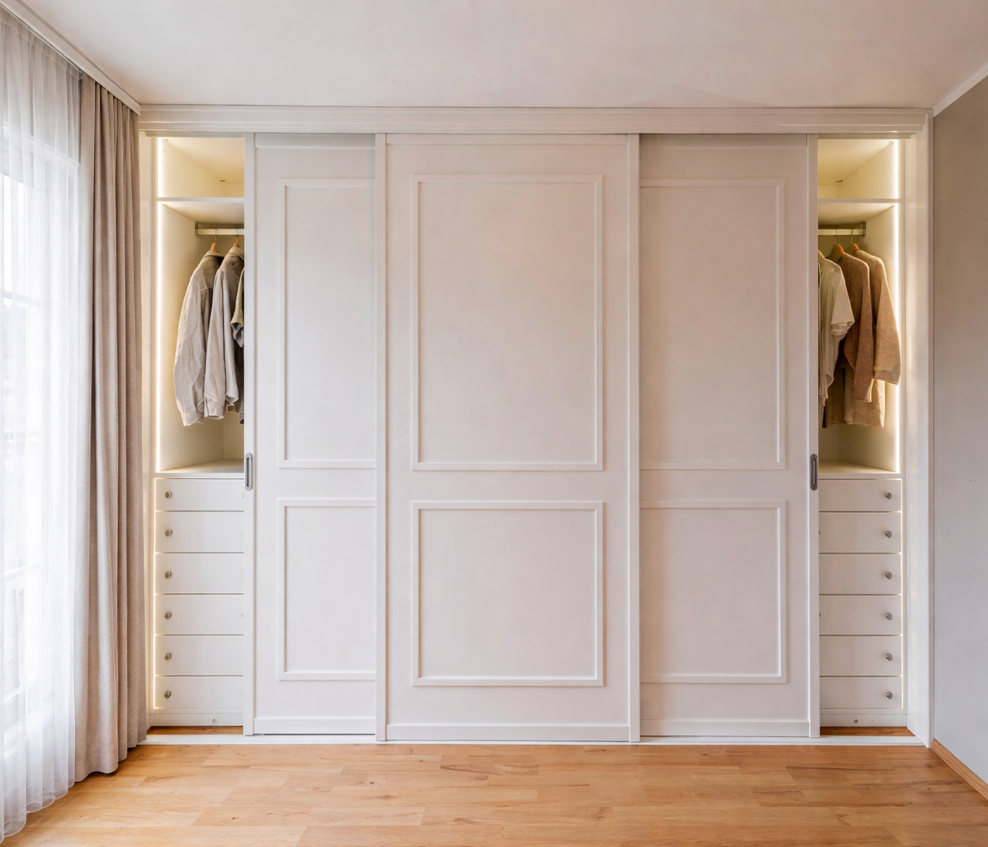 Our Laminated Wardrobes are made from high-quality engineered boards and finished with premium laminated sheets, they offer elegant options ranging from natural wood grains to high-gloss contemporary colors. Each wardrobe is fully customised to suit the customer’s space, style, and budget, allowing complete freedom to choose layouts, finishes, and features while ensuring durability, moisture resistance, and everyday practicality.